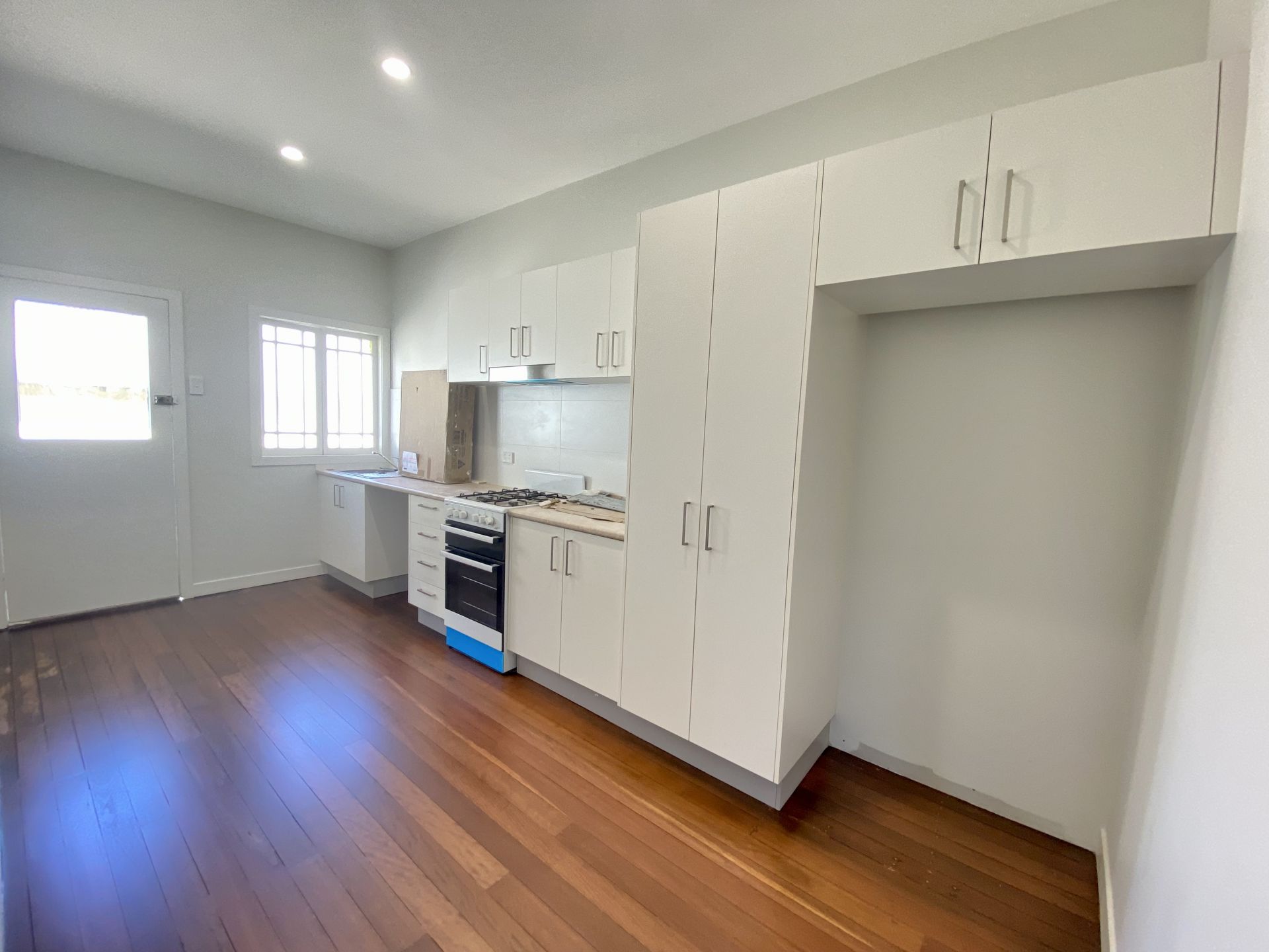 - Kitchen with gas stovetop, rangehood and good storage