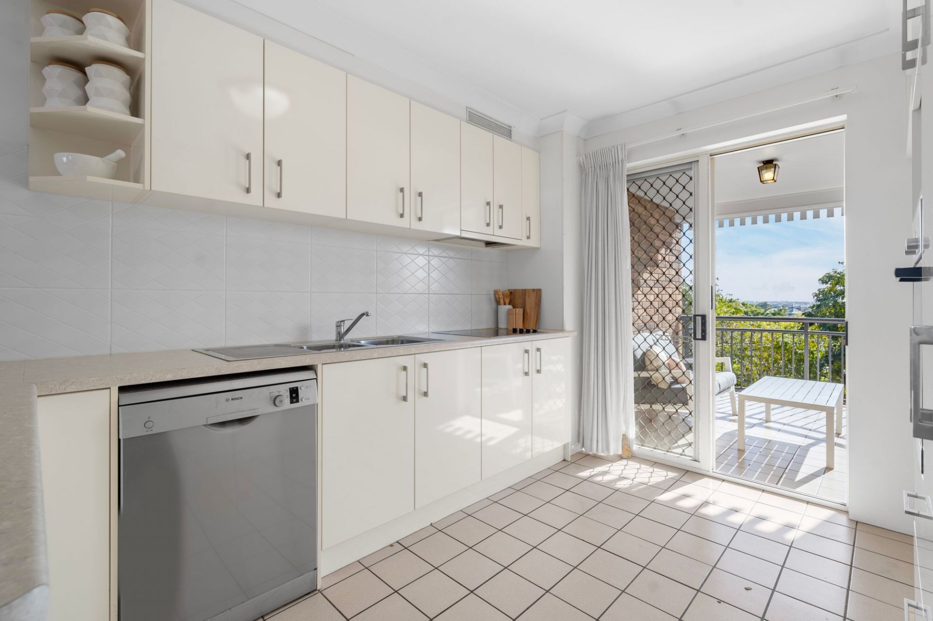 The kitchen is smart, practical and well equipped, including a dishwasher and wall oven, interacting well with the living and dining areas, and opening directly onto a north east facing verandah.